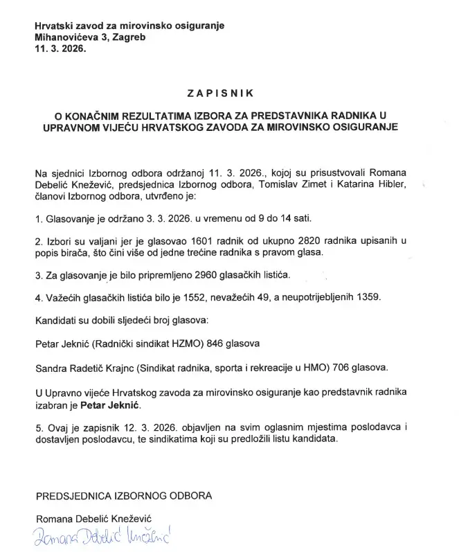 U nastavku možete pronaći službeni Zapisnik o konačnim rezultatima izbora za predstavnika radnika u Upravno vijeće Hrvatskog zavoda za mirovinsko osiguranje te rezultate po područnim službama i uredima.